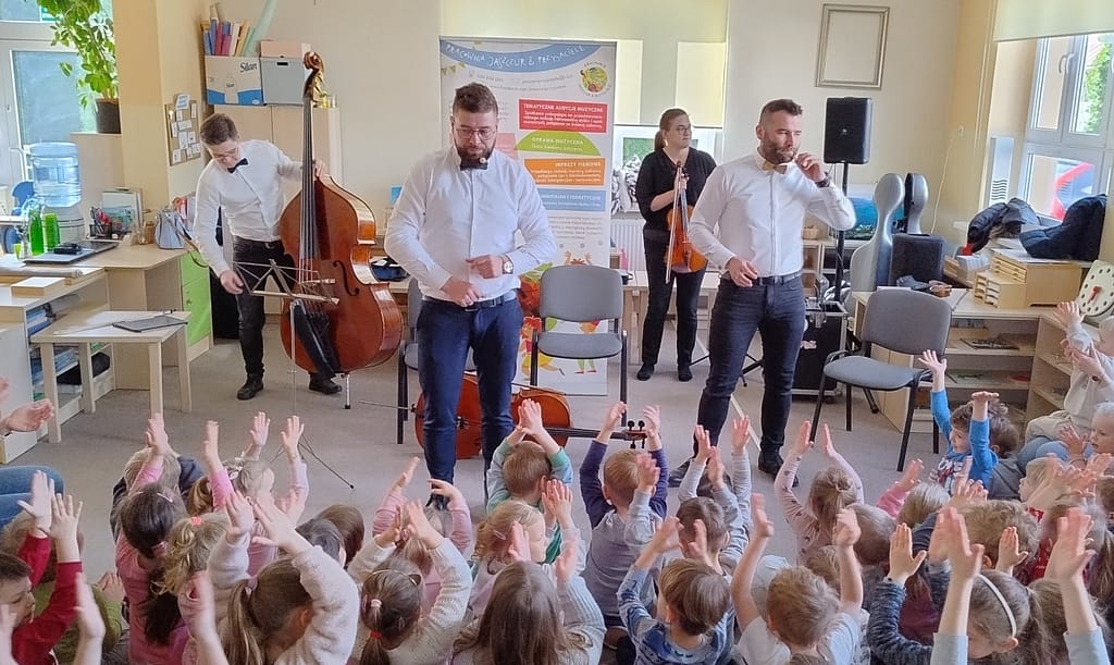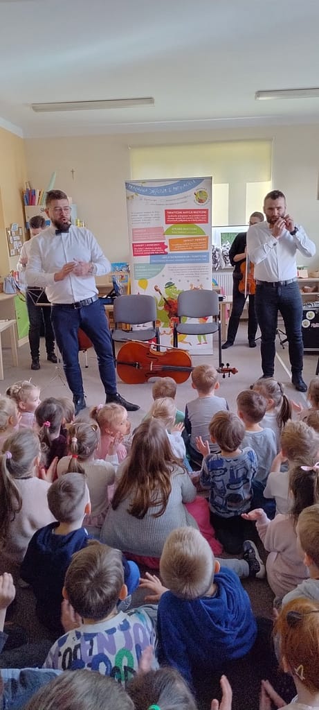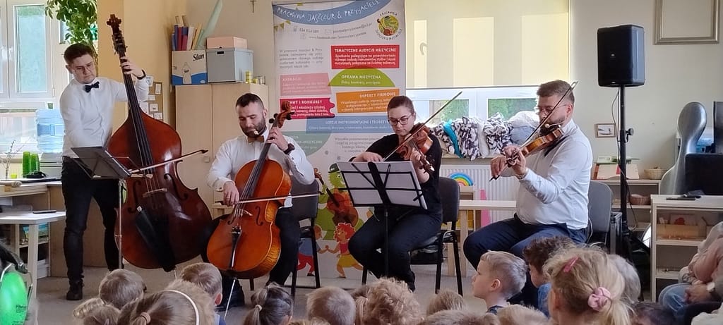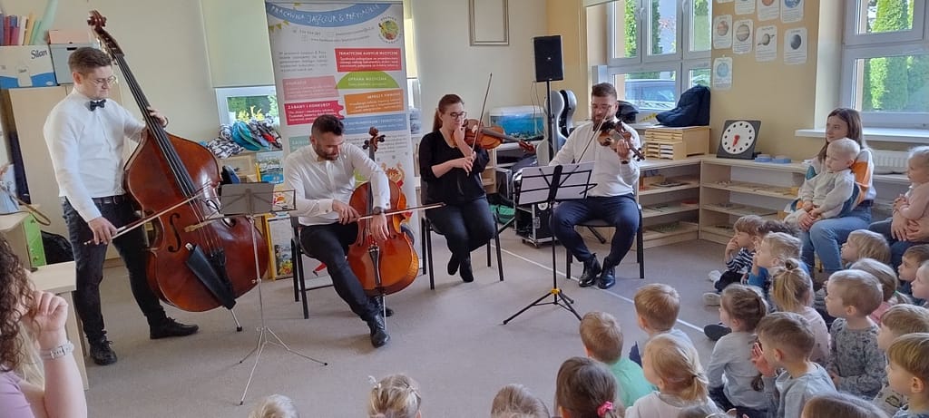 Podczas kolejnego w tym roku – kwietniowego spotkania z Pracownią Jaszczur &Przyjaciele mieliśmy okazję poznać budowę i usłyszeć dźwięki czterech instrumentów smyczkowych – skrzypce, altówka, wiolonczela, kontrabas. Nasi goście wyjaśnili dzieciom, co oznaczają pojęcia- kwartet, trio, duet, solo. Usłyszeliśmy też utwory takie jak; „Yesterdey” Paula McCartneya, „Sway” Michaela Bublea oraz muzykę z filmów dla dzieci „Pocahontas” i „Kraina lodu”. Dziękujemy naszym gościom za kolejne ciekawe spotkanie z muzyką.