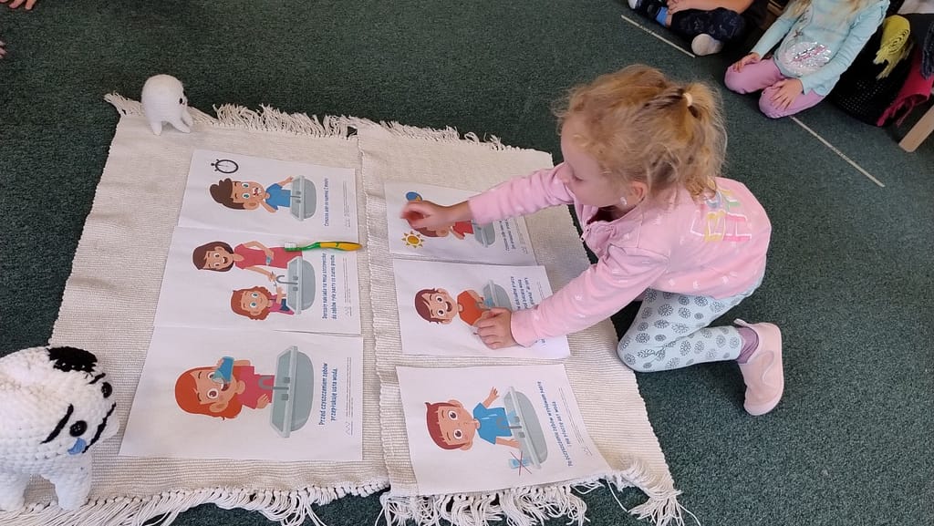 Tym razem pani Elżbieta – higienistka stomatologiczna – odwiedziła w naszym przedszkolu grupę żółtą i niebieską. Dzieci dowiedziały się, jak prawidłowo myć zęby i dlaczego higiena jamy ustnej jest szczególnie istotna. Przedszkolaki wzięły również udział w przeglądzie dentystycznym.