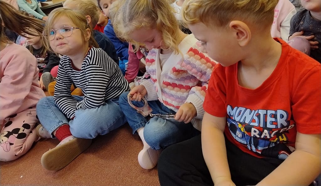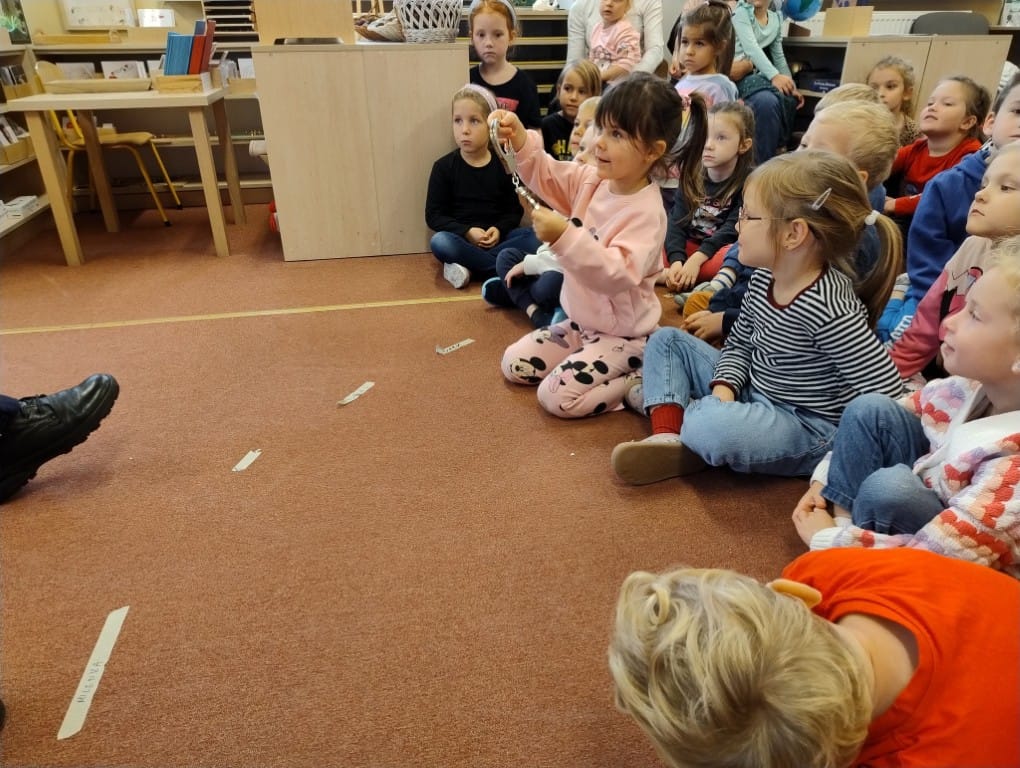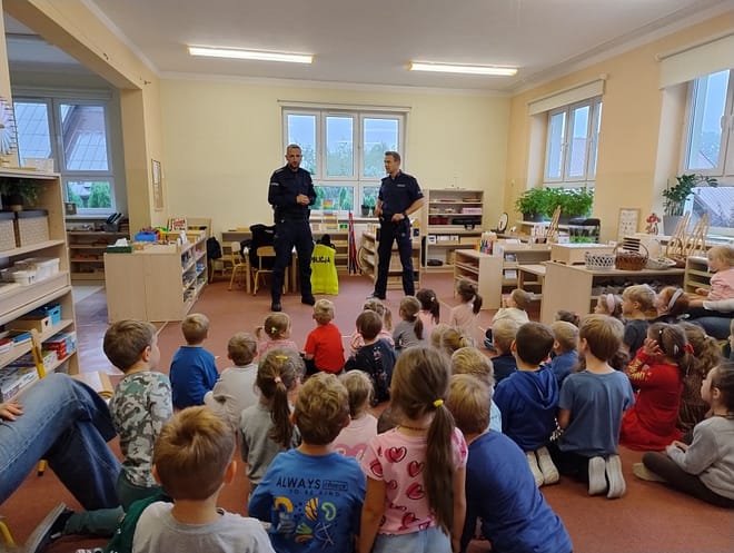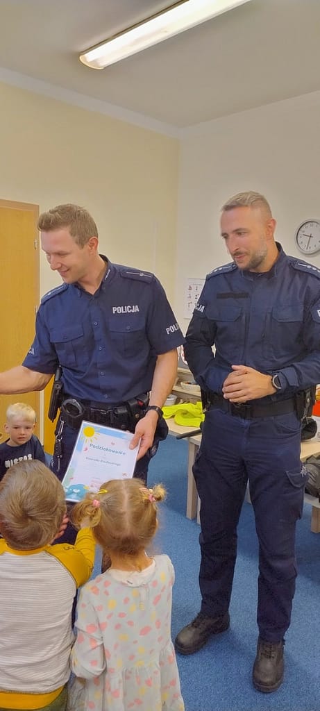7 października 2025 roku nasze przedszkole odwiedzili panowie policjanci. Podczas spotkania przybliżyli dzieciom swój zawód – omawiali wykonywane przez policjantów czynności, obowiązki, przedstawili dzieciom narzędzia niezbędne w tej pracy oraz odpowiedni ubiór. Nasi goście przypomnieli najważniejsze zasady bezpiecznego zachowania się podczas jazdy samochodem oraz pieszej wędrówki chodnikiem. Dzieci wysłuchały policyjnych rad oraz zadały wiele interesujących pytań. Dziękujemy serdecznie za odwiedziny, rozmowę oraz za przybliżenie tematu specyfiki pracy w policji.
