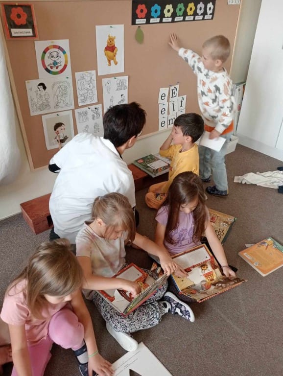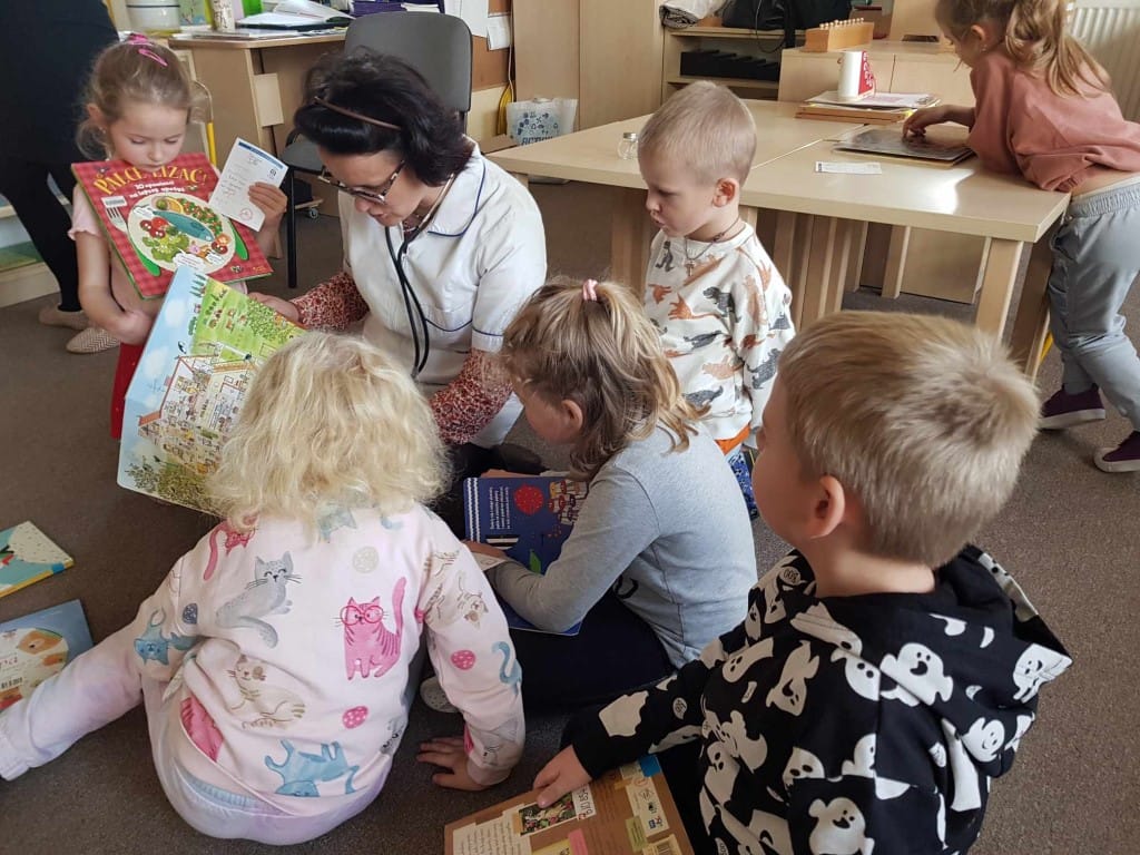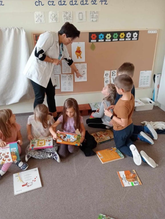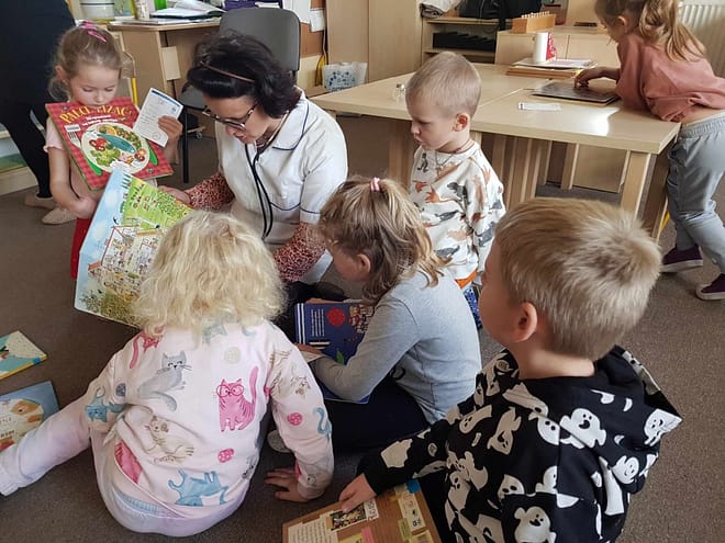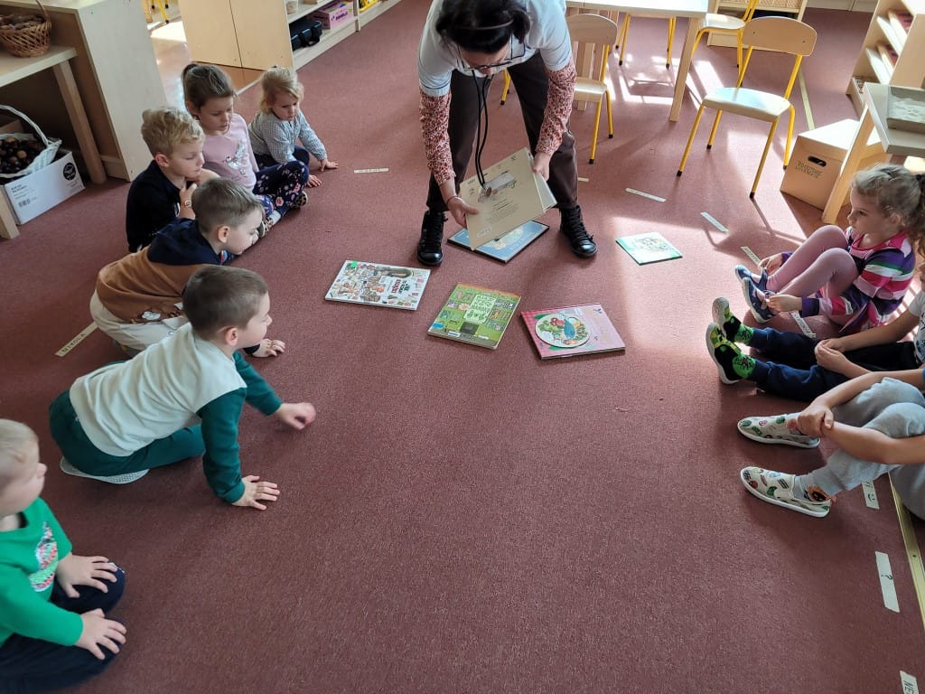 „Pogotowie literackie” – czyli przedstawienie różnych sposobów zachęcających do czytania książek. W grupie niebieskiej i żółtej „Z dźwiękami wśród książek” – muzyczna zabawa z wykorzystaniem instrumentów muzycznych i utworów literackich dla dzieci.