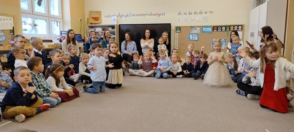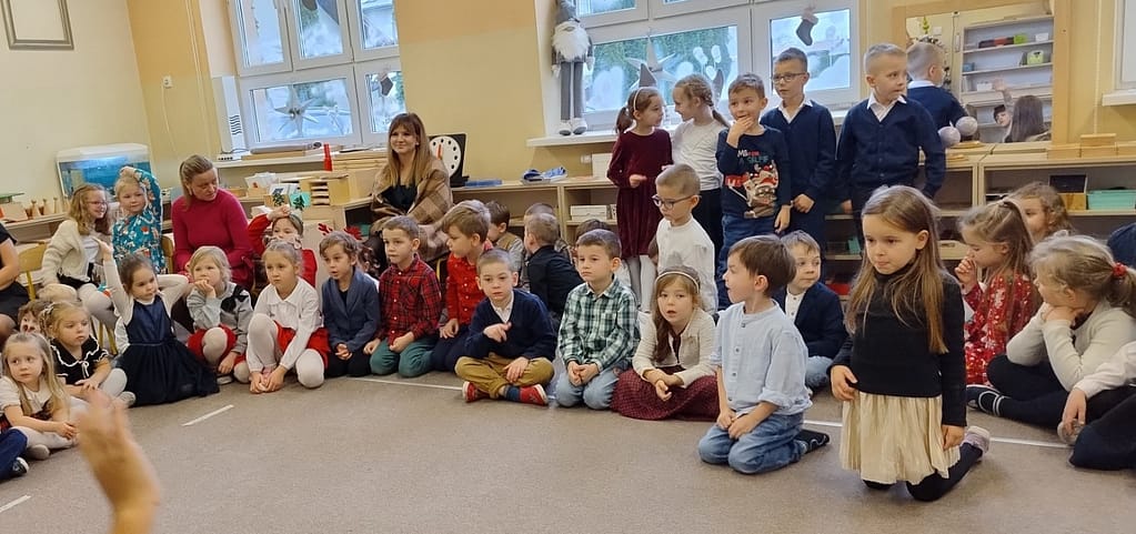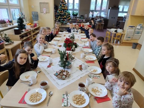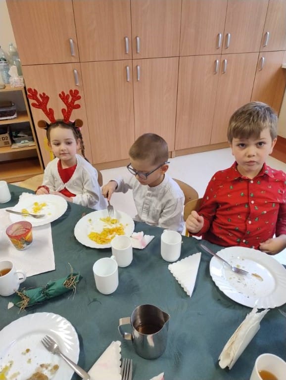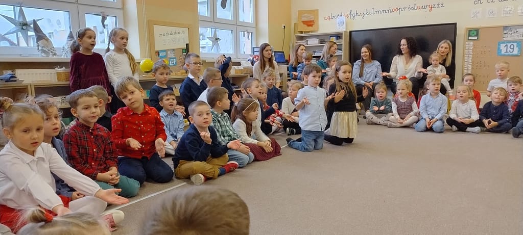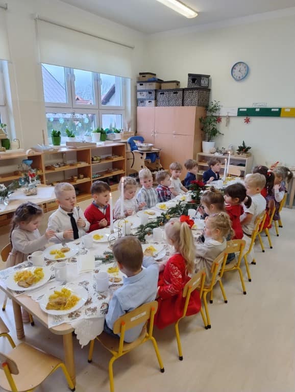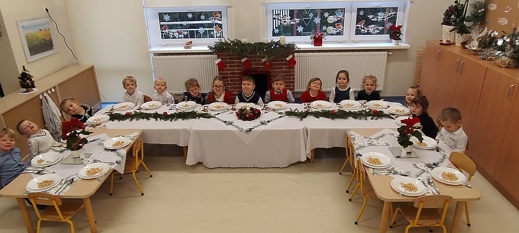 20 grudnia w piątek w naszym przedszkolu odbyło się wspólne kolędowanie. Wszystkie dzieci wraz z paniami oraz Dyrekcją odśpiewały najbardziej znane polskie kolędy i pastorałki. Wśród pięknie wyśpiewanych przez dzieci utworów nie zabrakło kolęd: „Wśród nocnej ciszy”, „Przybieżeli do Betlejem”, „Pójdźmy wszyscy do stajenki” oraz pastorałek : „Gore gwiazda Jezusowi” i „Świeć gwiazdeczko świeć”. Szczególne podziękowania składamy pani Kindze oraz pani Monice za wprowadzenie pięknego uroczystego klimatu poprzez grę na instrumentach muzycznych – na gitarze oraz flecie. Dziękujemy również wszystkim dzieciom za udział w uroczystym wigilijnym posiłku.
